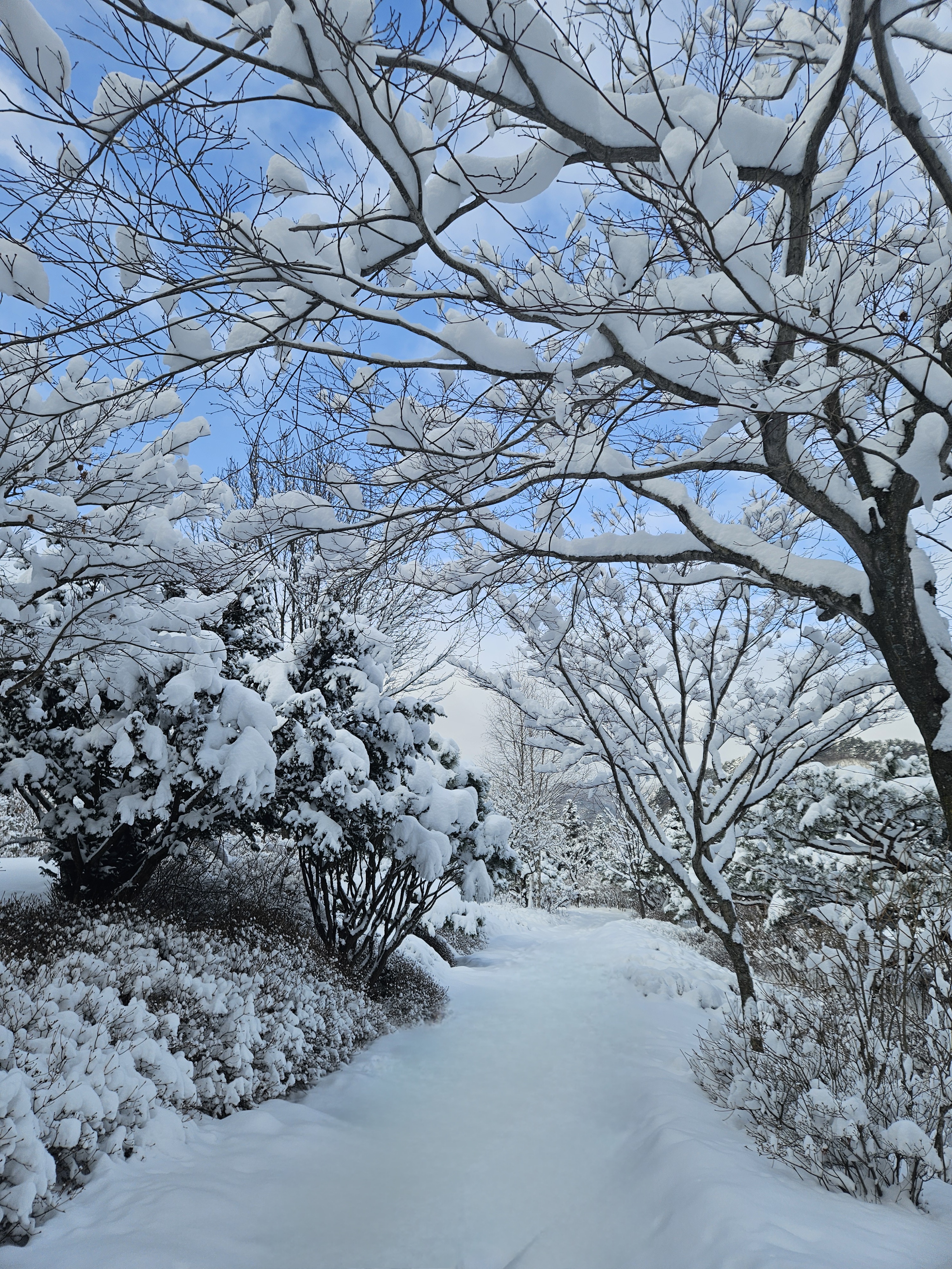 화려한 꽃은 없지만, 상록수의 푸르름과 하얀 눈의 대비는 그 자체로 한 폭의 수묵화 같습니다. 오히려 시각적인 자극이 덜해서, 아이들과 조용히 대화를 나누며 걷기에 이보다 좋은 곳은 없었어요.