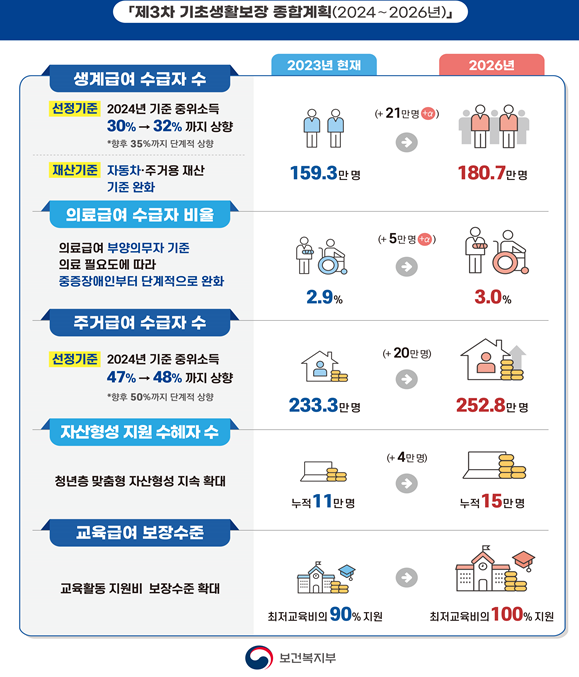교육급여는 전체 가구 소득의 중간값인 기준 중위소득에서 50% 이하인 가구를 대상으로 합니다.